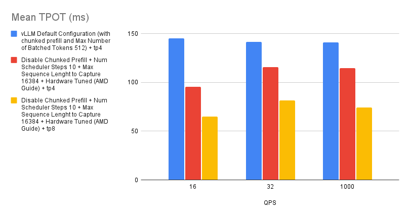 Based on the experiment we ran, we found that there’s a slight improvement with tuning the chunked prefill values over disabling the chunked prefill feature. However, if you’re not sure whether to enable chunked prefill or not, simply start off by disabling it and you should generally expect better performance than with using the default settings. This is specific to MI300X GPUs.